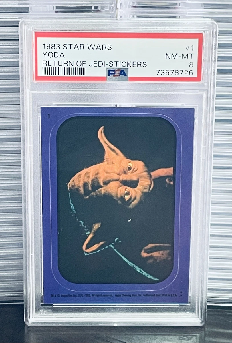 Yoda 1983 Star Wars Return Of The Jedi Purple Sticker Card 1 Psa 8 Low Pop 16 Ebay